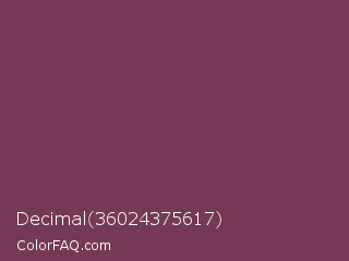 Decimal 36024375617 Color is a normal rose color and the nearest color is Cosmic #76395d. Hex code #763955 and RGB value is rgb(118,57,85). In RGB color space, this color is composed of 46% red, 22% green, 33% blue, In CMYK color space, this color is composed of 0% cyan, 52% magenta, 28% yellow , 54% black , In HSL color space, this color has a hue angle of 332° , 35% saturation and 34% lightness.