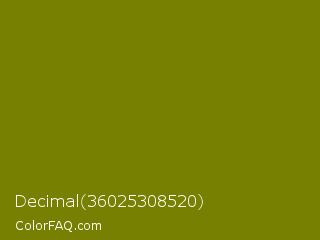 Decimal 36025308520 Color is a dark yellow color and the nearest color is Olive #808000. Hex code #778000 and RGB value is rgb(119,128,0). In RGB color space, this color is composed of 47% red, 50% green, 0% blue, In CMYK color space, this color is composed of 7% cyan, 0% magenta, 100% yellow , 50% black , In HSL color space, this color has a hue angle of 64° , 100% saturation and 25% lightness.