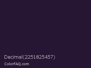 Decimal 2251825457 Color is a very dark purple color and the nearest color is Revolver #2c1632. Hex code #261633 and RGB value is rgb(38,22,51). In RGB color space, this color is composed of 15% red, 9% green, 20% blue, In CMYK color space, this color is composed of 25% cyan, 57% magenta, 0% yellow , 80% black , In HSL color space, this color has a hue angle of 273° , 40% saturation and 14% lightness.