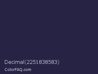 Decimal 2251838583 Color is a very dark indigo color and the nearest color is Port Gore #251f4f. Hex code #262345 and RGB value is rgb(38,35,69). In RGB color space, this color is composed of 15% red, 14% green, 27% blue, In CMYK color space, this color is composed of 45% cyan, 49% magenta, 0% yellow , 73% black , In HSL color space, this color has a hue angle of 245° , 33% saturation and 20% lightness.