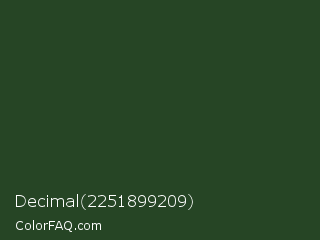 Decimal 2251899209 Color is a very dark green color and the nearest color is Cal Poly Pomona Green #1e4d2b. Hex code #264525 and RGB value is rgb(38,69,37). In RGB color space, this color is composed of 15% red, 27% green, 15% blue, In CMYK color space, this color is composed of 45% cyan, 0% magenta, 46% yellow , 73% black , In HSL color space, this color has a hue angle of 118° , 30% saturation and 21% lightness.