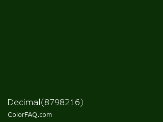 Decimal 8798216 Color is a very dark green color and the nearest color is Deep Forest Green #182d09. Hex code #0d2f08 and RGB value is rgb(13,47,8). In RGB color space, this color is composed of 5% red, 18% green, 3% blue, In CMYK color space, this color is composed of 72% cyan, 0% magenta, 83% yellow , 82% black , In HSL color space, this color has a hue angle of 112° , 71% saturation and 11% lightness.
