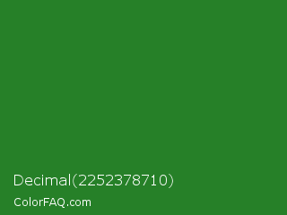 Decimal 2252378710 Color is a normal green color and the nearest color is Forest Green #228b22. Hex code #268028 and RGB value is rgb(38,128,40). In RGB color space, this color is composed of 15% red, 50% green, 16% blue, In CMYK color space, this color is composed of 70% cyan, 0% magenta, 69% yellow , 50% black , In HSL color space, this color has a hue angle of 121° , 54% saturation and 33% lightness.