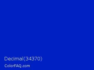 Decimal 34370 Color is a normal blue color and the nearest color is Blue Pantone #0018a8. Hex code #0021c2 and RGB value is rgb(0,33,194). In RGB color space, this color is composed of 0% red, 13% green, 76% blue, In CMYK color space, this color is composed of 100% cyan, 83% magenta, 0% yellow , 24% black , In HSL color space, this color has a hue angle of 230° , 100% saturation and 38% lightness.