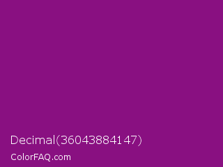 Decimal 36043884147 Color is a dark magenta color and the nearest color is Mardi Gras #880085. Hex code #891081 and RGB value is rgb(137,16,129). In RGB color space, this color is composed of 54% red, 6% green, 51% blue, In CMYK color space, this color is composed of 0% cyan, 88% magenta, 6% yellow , 46% black , In HSL color space, this color has a hue angle of 304° , 79% saturation and 30% lightness.