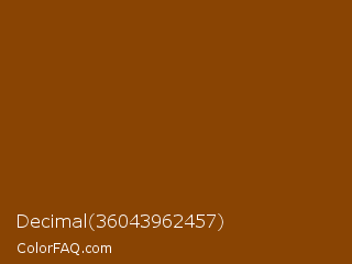 Decimal 36043962457 Color is a dark orange color and the nearest color is Peru Tan #7f3a02. Hex code #894403 and RGB value is rgb(137,68,3). In RGB color space, this color is composed of 54% red, 27% green, 1% blue, In CMYK color space, this color is composed of 0% cyan, 50% magenta, 98% yellow , 46% black , In HSL color space, this color has a hue angle of 29° , 96% saturation and 27% lightness.