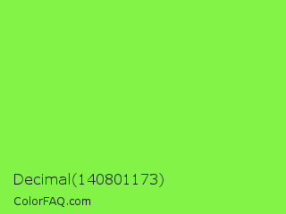 Decimal 140801173 Color is a light green color and the nearest color is Kiwi #8ee53f. Hex code #83f347 and RGB value is rgb(131,243,71). In RGB color space, this color is composed of 51% red, 95% green, 28% blue, In CMYK color space, this color is composed of 46% cyan, 0% magenta, 71% yellow , 5% black , In HSL color space, this color has a hue angle of 99° , 88% saturation and 62% lightness.