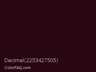 Decimal 2253427505 Color is a almost black rose color and the nearest color is Gondola #261414. Hex code #280713 and RGB value is rgb(40,7,19). In RGB color space, this color is composed of 16% red, 3% green, 7% blue, In CMYK color space, this color is composed of 0% cyan, 83% magenta, 53% yellow , 84% black , In HSL color space, this color has a hue angle of 338° , 70% saturation and 9% lightness.