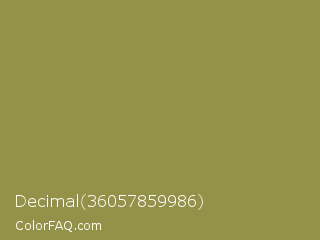 Decimal 36057859986 Color is a normal yellow color and the nearest color is Sycamore #908d39. Hex code #949248 and RGB value is rgb(148,146,72). In RGB color space, this color is composed of 58% red, 57% green, 28% blue, In CMYK color space, this color is composed of 0% cyan, 1% magenta, 51% yellow , 42% black , In HSL color space, this color has a hue angle of 58° , 35% saturation and 43% lightness.