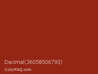 Decimal 36058506793 Color is a normal red color and the nearest color is Tabasco #a02712. Hex code #952615 and RGB value is rgb(149,38,21). In RGB color space, this color is composed of 58% red, 15% green, 8% blue, In CMYK color space, this color is composed of 0% cyan, 74% magenta, 86% yellow , 42% black , In HSL color space, this color has a hue angle of 8° , 75% saturation and 33% lightness.