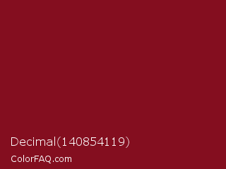 Decimal 140854119 Color is a dark red color and the nearest color is Monarch #8b0723. Hex code #840e1f and RGB value is rgb(132,14,31). In RGB color space, this color is composed of 52% red, 5% green, 12% blue, In CMYK color space, this color is composed of 0% cyan, 89% magenta, 77% yellow , 48% black , In HSL color space, this color has a hue angle of 351° , 81% saturation and 29% lightness.