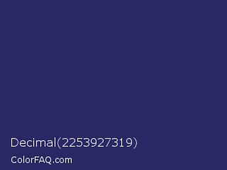 Decimal 2253927319 Color is a dark indigo color and the nearest color is Deep Koamaru #333366. Hex code #292865 and RGB value is rgb(41,40,101). In RGB color space, this color is composed of 16% red, 16% green, 40% blue, In CMYK color space, this color is composed of 59% cyan, 60% magenta, 0% yellow , 60% black , In HSL color space, this color has a hue angle of 241° , 43% saturation and 28% lightness.