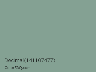Decimal 141107477 Color is a normal green color and the nearest color is Mantle #8b9c90. Hex code #84a193 and RGB value is rgb(132,161,147). In RGB color space, this color is composed of 52% red, 63% green, 58% blue, In CMYK color space, this color is composed of 18% cyan, 0% magenta, 9% yellow , 37% black , In HSL color space, this color has a hue angle of 151° , 13% saturation and 57% lightness.