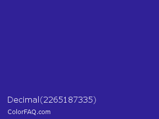Decimal 2265187335 Color is a normal indigo color and the nearest color is Blue Pigment #333399. Hex code #302197 and RGB value is rgb(48,33,151). In RGB color space, this color is composed of 19% red, 13% green, 59% blue, In CMYK color space, this color is composed of 68% cyan, 78% magenta, 0% yellow , 41% black , In HSL color space, this color has a hue angle of 248° , 64% saturation and 36% lightness.