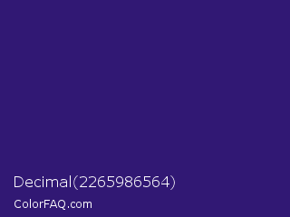 Decimal 2265986564 Color is a dark indigo color and the nearest color is Persian Indigo #32127a. Hex code #311874 and RGB value is rgb(49,24,116). In RGB color space, this color is composed of 19% red, 9% green, 45% blue, In CMYK color space, this color is composed of 58% cyan, 79% magenta, 0% yellow , 55% black , In HSL color space, this color has a hue angle of 256° , 66% saturation and 27% lightness.