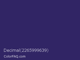 Decimal 2265999639 Color is a dark indigo color and the nearest color is Jacarta #3a2a6a. Hex code #312565 and RGB value is rgb(49,37,101). In RGB color space, this color is composed of 19% red, 15% green, 40% blue, In CMYK color space, this color is composed of 51% cyan, 63% magenta, 0% yellow , 60% black , In HSL color space, this color has a hue angle of 251° , 46% saturation and 27% lightness.