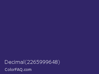 Decimal 2265999648 Color is a dark indigo color and the nearest color is Jacarta #3a2a6a. Hex code #312568 and RGB value is rgb(49,37,104). In RGB color space, this color is composed of 19% red, 15% green, 41% blue, In CMYK color space, this color is composed of 53% cyan, 64% magenta, 0% yellow , 59% black , In HSL color space, this color has a hue angle of 251° , 48% saturation and 28% lightness.