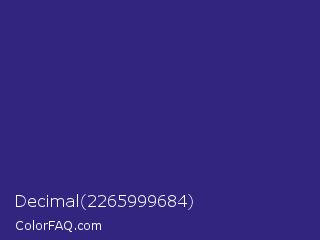 Decimal 2265999684 Color is a normal indigo color and the nearest color is Cosmic Cobalt #2e2d88. Hex code #312580 and RGB value is rgb(49,37,128). In RGB color space, this color is composed of 19% red, 15% green, 50% blue, In CMYK color space, this color is composed of 62% cyan, 71% magenta, 0% yellow , 50% black , In HSL color space, this color has a hue angle of 248° , 55% saturation and 32% lightness.