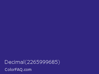 Decimal 2265999685 Color is a normal indigo color and the nearest color is Cosmic Cobalt #2e2d88. Hex code #312581 and RGB value is rgb(49,37,129). In RGB color space, this color is composed of 19% red, 15% green, 51% blue, In CMYK color space, this color is composed of 62% cyan, 71% magenta, 0% yellow , 49% black , In HSL color space, this color has a hue angle of 248° , 55% saturation and 33% lightness.