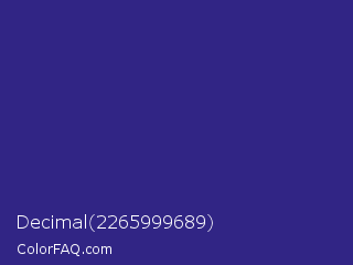 Decimal 2265999689 Color is a normal indigo color and the nearest color is Cosmic Cobalt #2e2d88. Hex code #312585 and RGB value is rgb(49,37,133). In RGB color space, this color is composed of 19% red, 15% green, 52% blue, In CMYK color space, this color is composed of 63% cyan, 72% magenta, 0% yellow , 48% black , In HSL color space, this color has a hue angle of 248° , 56% saturation and 33% lightness.