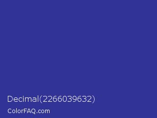 Decimal 2266039632 Color is a normal blue color and the nearest color is Blue Pigment #333399. Hex code #313396 and RGB value is rgb(49,51,150). In RGB color space, this color is composed of 19% red, 20% green, 59% blue, In CMYK color space, this color is composed of 67% cyan, 66% magenta, 0% yellow , 41% black , In HSL color space, this color has a hue angle of 239° , 51% saturation and 39% lightness.