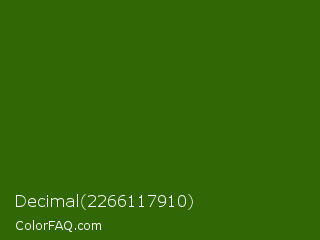 Decimal 2266117910 Color is a very dark green color and the nearest color is Dell #396413. Hex code #316704 and RGB value is rgb(49,103,4). In RGB color space, this color is composed of 19% red, 40% green, 2% blue, In CMYK color space, this color is composed of 52% cyan, 0% magenta, 96% yellow , 60% black , In HSL color space, this color has a hue angle of 93° , 93% saturation and 21% lightness.