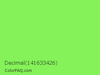 Decimal 141633426 Color is a light green color and the nearest color is Kiwi #8ee53f. Hex code #84f258 and RGB value is rgb(132,242,88). In RGB color space, this color is composed of 52% red, 95% green, 35% blue, In CMYK color space, this color is composed of 45% cyan, 0% magenta, 64% yellow , 5% black , In HSL color space, this color has a hue angle of 103° , 86% saturation and 65% lightness.