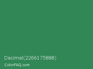 Decimal 2266175888 Color is a normal green color and the nearest color is Sea Green #2e8b57. Hex code #318756 and RGB value is rgb(49,135,86). In RGB color space, this color is composed of 19% red, 53% green, 34% blue, In CMYK color space, this color is composed of 64% cyan, 0% magenta, 36% yellow , 47% black , In HSL color space, this color has a hue angle of 146° , 47% saturation and 36% lightness.