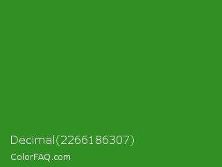 Decimal 2266186307 Color is a normal green color and the nearest color is Slimy Green #299617. Hex code #319023 and RGB value is rgb(49,144,35). In RGB color space, this color is composed of 19% red, 56% green, 14% blue, In CMYK color space, this color is composed of 66% cyan, 0% magenta, 76% yellow , 44% black , In HSL color space, this color has a hue angle of 112° , 61% saturation and 35% lightness.