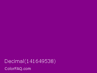 Decimal 141649538 Color is a dark magenta color and the nearest color is Mardi Gras #880085. Hex code #85018a and RGB value is rgb(133,1,138). In RGB color space, this color is composed of 52% red, 0% green, 54% blue, In CMYK color space, this color is composed of 4% cyan, 99% magenta, 0% yellow , 46% black , In HSL color space, this color has a hue angle of 298° , 99% saturation and 27% lightness.