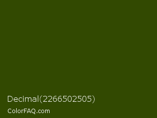 Decimal 2266502505 Color is a very dark lime color and the nearest color is Clover #384910. Hex code #324901 and RGB value is rgb(50,73,1). In RGB color space, this color is composed of 20% red, 29% green, 0% blue, In CMYK color space, this color is composed of 32% cyan, 0% magenta, 99% yellow , 71% black , In HSL color space, this color has a hue angle of 79° , 97% saturation and 15% lightness.