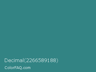 Decimal 2266589188 Color is a normal cyan color and the nearest color is Paradiso #317d82. Hex code #328484 and RGB value is rgb(50,132,132). In RGB color space, this color is composed of 20% red, 52% green, 52% blue, In CMYK color space, this color is composed of 62% cyan, 0% magenta, 0% yellow , 48% black , In HSL color space, this color has a hue angle of 180° , 45% saturation and 36% lightness.