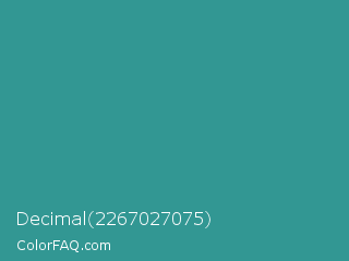Decimal 2267027075 Color is a normal cyan color and the nearest color is Zomp #39a78e. Hex code #329793 and RGB value is rgb(50,151,147). In RGB color space, this color is composed of 20% red, 59% green, 58% blue, In CMYK color space, this color is composed of 67% cyan, 0% magenta, 3% yellow , 41% black , In HSL color space, this color has a hue angle of 178° , 50% saturation and 39% lightness.