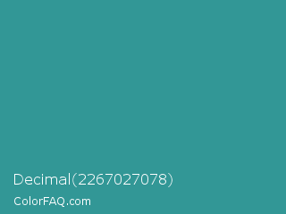 Decimal 2267027078 Color is a normal cyan color and the nearest color is Zomp #39a78e. Hex code #329796 and RGB value is rgb(50,151,150). In RGB color space, this color is composed of 20% red, 59% green, 59% blue, In CMYK color space, this color is composed of 67% cyan, 0% magenta, 1% yellow , 41% black , In HSL color space, this color has a hue angle of 179° , 50% saturation and 39% lightness.