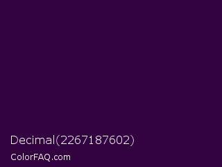 Decimal 2267187602 Color is a very dark purple color and the nearest color is Mardi Gras #350036. Hex code #330240 and RGB value is rgb(51,2,64). In RGB color space, this color is composed of 20% red, 1% green, 25% blue, In CMYK color space, this color is composed of 20% cyan, 97% magenta, 0% yellow , 75% black , In HSL color space, this color has a hue angle of 287° , 94% saturation and 13% lightness.