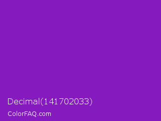Decimal 141702033 Color is a normal purple color and the nearest color is French Violet #8806ce. Hex code #851bbf and RGB value is rgb(133,27,191). In RGB color space, this color is composed of 52% red, 11% green, 75% blue, In CMYK color space, this color is composed of 30% cyan, 86% magenta, 0% yellow , 25% black , In HSL color space, this color has a hue angle of 279° , 75% saturation and 43% lightness.