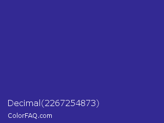 Decimal 2267254873 Color is a normal indigo color and the nearest color is Blue Pigment #333399. Hex code #332993 and RGB value is rgb(51,41,147). In RGB color space, this color is composed of 20% red, 16% green, 58% blue, In CMYK color space, this color is composed of 65% cyan, 72% magenta, 0% yellow , 42% black , In HSL color space, this color has a hue angle of 246° , 56% saturation and 37% lightness.