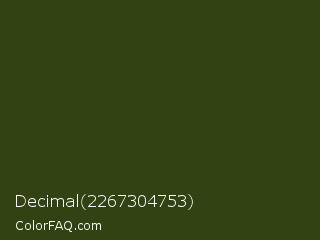 Decimal 2267304753 Color is a very dark lime color and the nearest color is Waiouru #363c0d. Hex code #334213 and RGB value is rgb(51,66,19). In RGB color space, this color is composed of 20% red, 26% green, 7% blue, In CMYK color space, this color is composed of 23% cyan, 0% magenta, 71% yellow , 74% black , In HSL color space, this color has a hue angle of 79° , 55% saturation and 17% lightness.