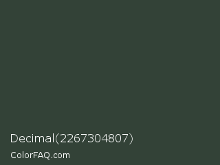 Decimal 2267304807 Color is a dark green color and the nearest color is Kombu Green #354230. Hex code #334237 and RGB value is rgb(51,66,55). In RGB color space, this color is composed of 20% red, 26% green, 22% blue, In CMYK color space, this color is composed of 23% cyan, 0% magenta, 17% yellow , 74% black , In HSL color space, this color has a hue angle of 136° , 13% saturation and 23% lightness.