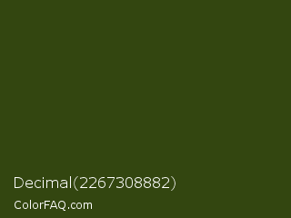 Decimal 2267308882 Color is a very dark green color and the nearest color is Clover #384910. Hex code #334610 and RGB value is rgb(51,70,16). In RGB color space, this color is composed of 20% red, 27% green, 6% blue, In CMYK color space, this color is composed of 27% cyan, 0% magenta, 77% yellow , 73% black , In HSL color space, this color has a hue angle of 81° , 63% saturation and 17% lightness.