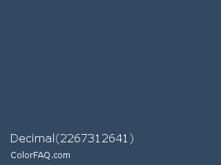 Decimal 2267312641 Color is a dark blue color and the nearest color is Pickled Bluewood #314459. Hex code #334961 and RGB value is rgb(51,73,97). In RGB color space, this color is composed of 20% red, 29% green, 38% blue, In CMYK color space, this color is composed of 47% cyan, 25% magenta, 0% yellow , 62% black , In HSL color space, this color has a hue angle of 211° , 31% saturation and 29% lightness.
