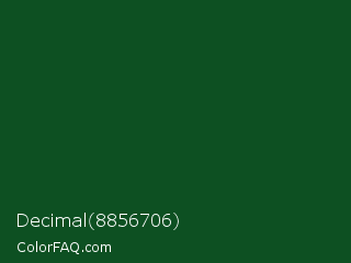 Decimal 8856706 Color is a very dark green color and the nearest color is Parsley #134f19. Hex code #0d5022 and RGB value is rgb(13,80,34). In RGB color space, this color is composed of 5% red, 31% green, 13% blue, In CMYK color space, this color is composed of 84% cyan, 0% magenta, 58% yellow , 69% black , In HSL color space, this color has a hue angle of 139° , 72% saturation and 18% lightness.