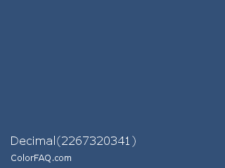 Decimal 2267320341 Color is a normal blue color and the nearest color is San Juan #304b6a. Hex code #335077 and RGB value is rgb(51,80,119). In RGB color space, this color is composed of 20% red, 31% green, 47% blue, In CMYK color space, this color is composed of 57% cyan, 33% magenta, 0% yellow , 53% black , In HSL color space, this color has a hue angle of 214° , 40% saturation and 33% lightness.