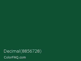 Decimal 8856728 Color is a very dark green color and the nearest color is MSU Green #18453b. Hex code #0d5032 and RGB value is rgb(13,80,50). In RGB color space, this color is composed of 5% red, 31% green, 20% blue, In CMYK color space, this color is composed of 84% cyan, 0% magenta, 38% yellow , 69% black , In HSL color space, this color has a hue angle of 153° , 72% saturation and 18% lightness.