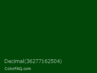 Decimal 36277162504 Color is a very dark green color and the nearest color is Dark Fern #0a480d. Hex code #014808 and RGB value is rgb(1,72,8). In RGB color space, this color is composed of 0% red, 28% green, 3% blue, In CMYK color space, this color is composed of 99% cyan, 0% magenta, 89% yellow , 72% black , In HSL color space, this color has a hue angle of 126° , 97% saturation and 14% lightness.