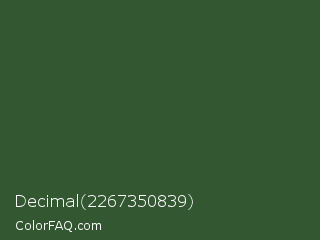 Decimal 2267350839 Color is a dark green color and the nearest color is Mughal Green #306030. Hex code #335731 and RGB value is rgb(51,87,49). In RGB color space, this color is composed of 20% red, 34% green, 19% blue, In CMYK color space, this color is composed of 41% cyan, 0% magenta, 44% yellow , 66% black , In HSL color space, this color has a hue angle of 117° , 28% saturation and 27% lightness.
