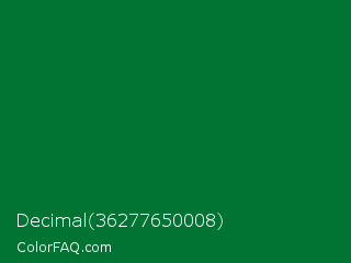 Decimal 36277650008 Color is a dark green color and the nearest color is La Salle Green #087830. Hex code #017332 and RGB value is rgb(1,115,50). In RGB color space, this color is composed of 0% red, 45% green, 20% blue, In CMYK color space, this color is composed of 99% cyan, 0% magenta, 57% yellow , 55% black , In HSL color space, this color has a hue angle of 146° , 98% saturation and 23% lightness.