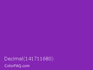 Decimal 141711680 Color is a normal purple color and the nearest color is Grape #6f2da8. Hex code #8525b4 and RGB value is rgb(133,37,180). In RGB color space, this color is composed of 52% red, 15% green, 71% blue, In CMYK color space, this color is composed of 26% cyan, 79% magenta, 0% yellow , 29% black , In HSL color space, this color has a hue angle of 280° , 66% saturation and 43% lightness.