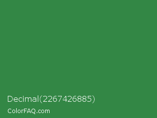 Decimal 2267426885 Color is a normal green color and the nearest color is Sea Green #2e8b57. Hex code #338745 and RGB value is rgb(51,135,69). In RGB color space, this color is composed of 20% red, 53% green, 27% blue, In CMYK color space, this color is composed of 62% cyan, 0% magenta, 49% yellow , 47% black , In HSL color space, this color has a hue angle of 133° , 45% saturation and 36% lightness.