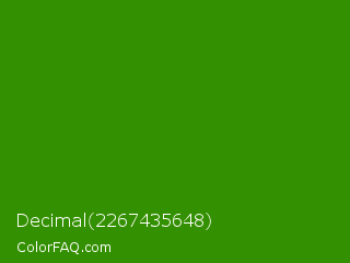 Decimal 2267435648 Color is a dark green color and the nearest color is Napier Green #2a8000. Hex code #339000 and RGB value is rgb(51,144,0). In RGB color space, this color is composed of 20% red, 56% green, 0% blue, In CMYK color space, this color is composed of 65% cyan, 0% magenta, 100% yellow , 44% black , In HSL color space, this color has a hue angle of 99° , 100% saturation and 28% lightness.